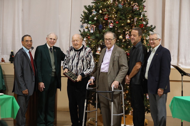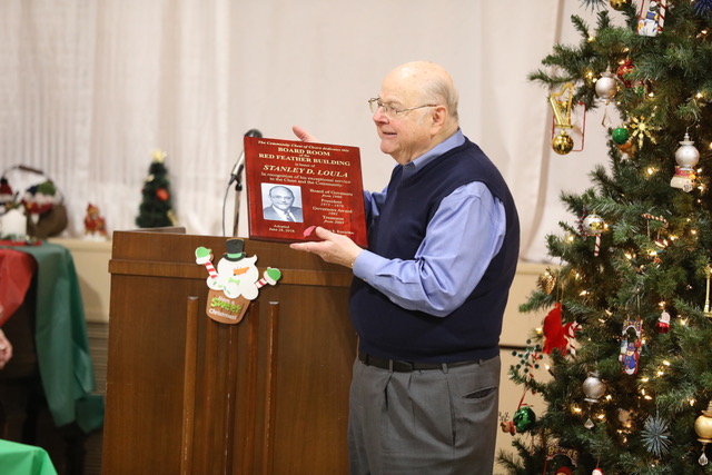 Stanley D. Loula, current Treasurer and board member since 1965, accepts a plaque commemorating his long service to the Chest and the naming of the Board Room after him.
