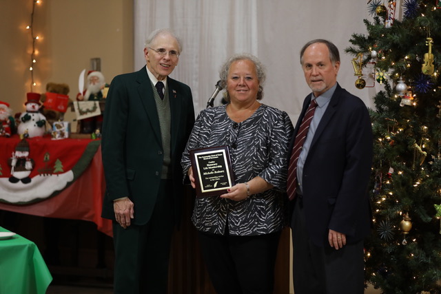 Michelle Bednarz, flanked by John S. Kociolko and Gary Nation, receives a plaque commemorating her long service as a board member.