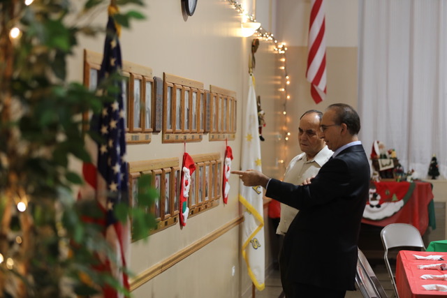 Ben Borbor, board member, makes a point with Gilberto Raices, Red Feather Building custodian.